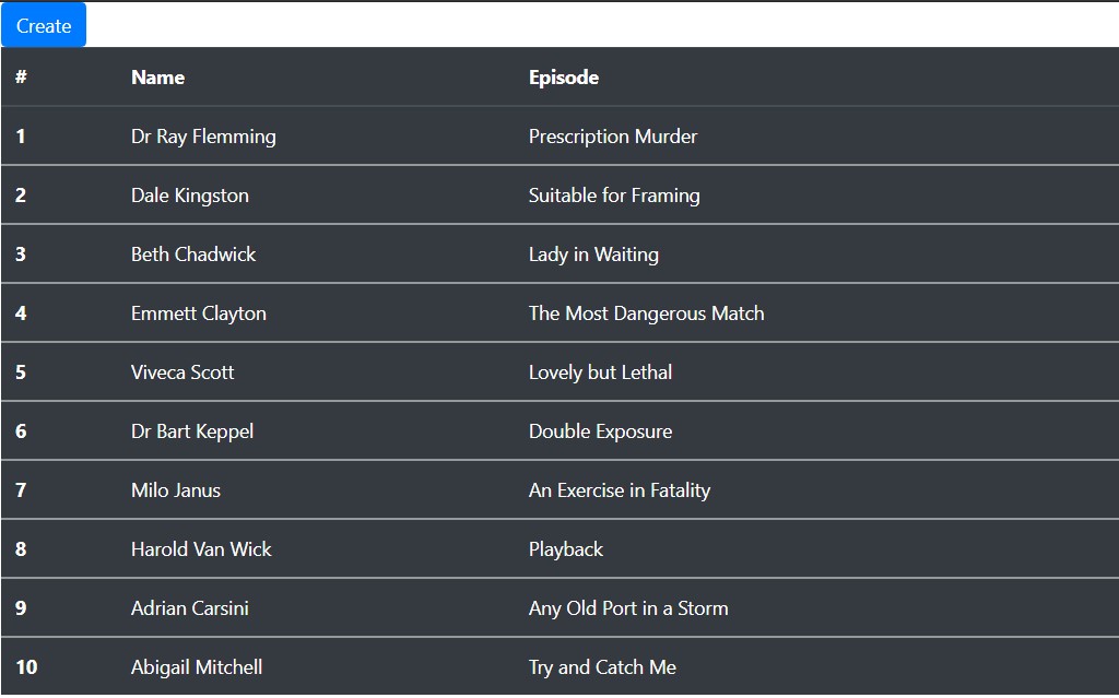 The form allows the user to enter three attributes to create a new villain. After entering the information, pressing the Create button saves a new villain to the database. In the context of this series the villain is saved to the in-memory-web-api.