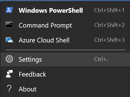 Open Settings either by the keyboard shortcut of CTRL + , or click the down arrow on the Windows Terminal tab bar.