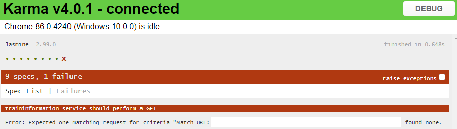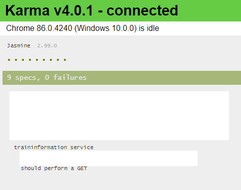 The next step is to call the subscribe method of getTrainInformation. People familiar with the Jasmine testing framework will be aware this doesn’t actually do anything until a method on httpTestingController is called.