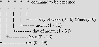 Adding a new entry to cron is straightforward once you understand the format. The first part, the five asterisks represent temporal information; when do you want the job to run. The diagram above shows what each asterisk represents.