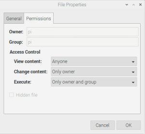 Save the script above as hdmi-off.sh in the pi home directory: /home/pi and make it executable by amending the Execute access control to “Only owner and group” as shown below