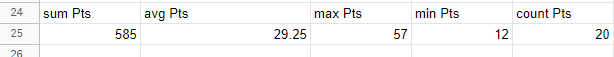 =QUERY(LeagueTable, "SELECT SUM(J), AVG(J), MAX(J), MIN(J), COUNT(J)", 1)