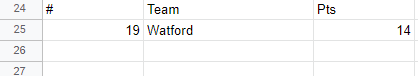 =QUERY(LeagueTable, "SELECT A,B,J WHERE B = 'Watford'", 1)