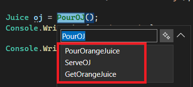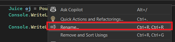 I would like a different name for the method PourOJ, so after selecting it and bringing up the context menu I see the standard Rename option.