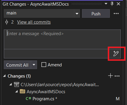 After renaming the method I would now like to commit the change and Copilot can help here as well. The Git changes view in Visual Studio has a button, framed in the red border which requests Copilot to generate a commit comment.